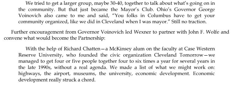 The Columbus Partnership pitches itself as “a non-profit, membership-based organization of CEOs from Columbus’ leading businesses and institutions” to “drive meaningful economic growth and prosperity for Columbus.”