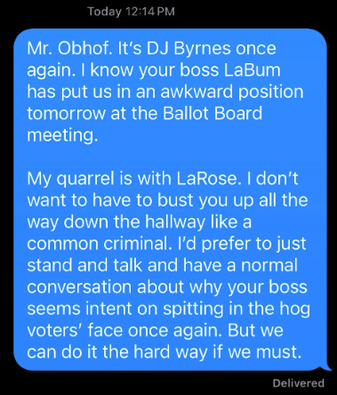 In his steed will be former State Senate President Larry Obhof, whom LaRose hired to the Secretary of State’s office as chief legal counsel for this specific fight. I texted Obhof yesterday to let him know that I’d prefer to do things the easy way and have a normal conversation with him at the Board meeting, as that’s more informative for the viewer.