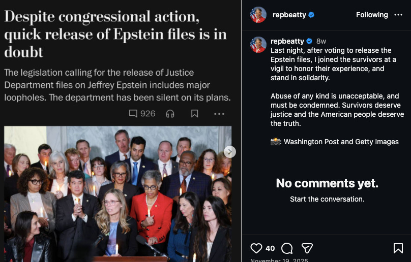 Beatty attended a candlelight vigil for Epstein victims on Nov. 19, but that sympathy apparently ended when Wexner, who, even under the most charitable timeline, financed a notorious international sex trafficker for decades while hand-picking another, lesser-known sex trafficker to resurrect a floundering lacrosse apparel brand.
