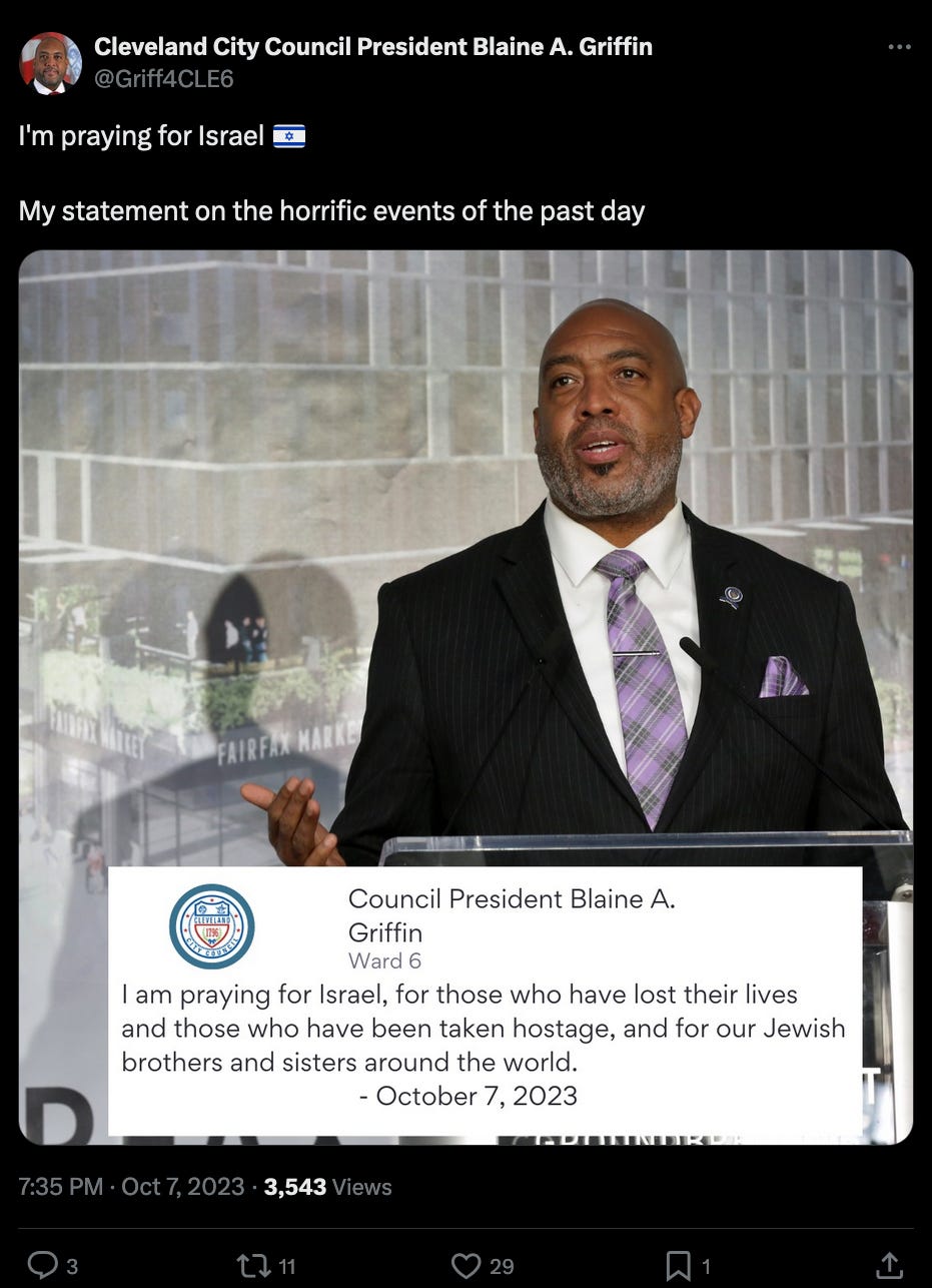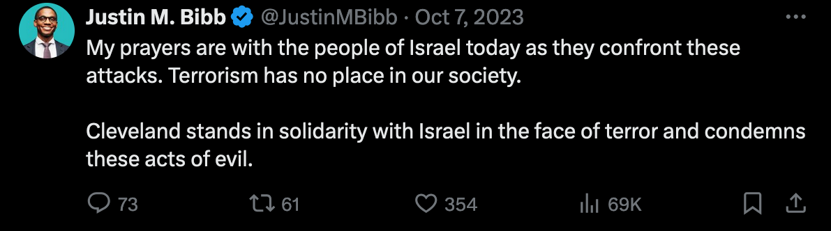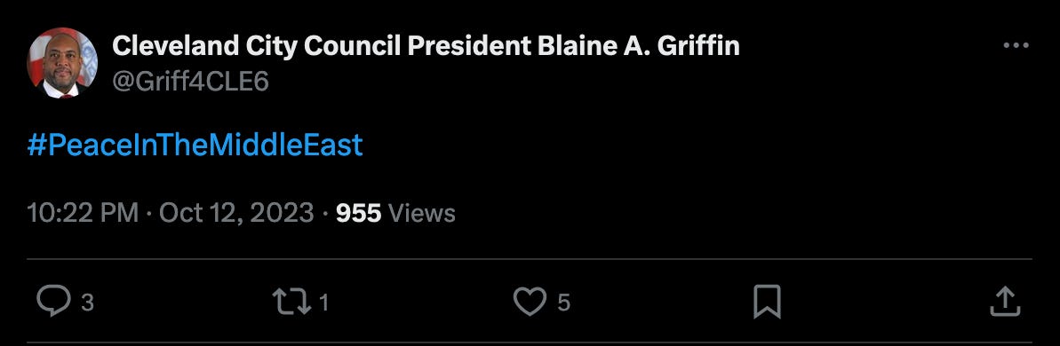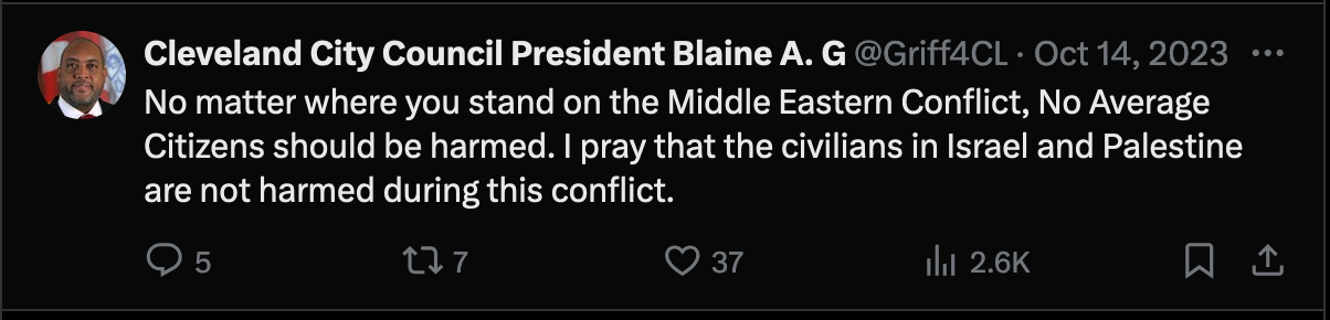 On Oct. 7, both Mayor Justin Bibb and Council President Blaine Griffin put out what probably seemed to them very banal statements following what was a genuinely shocking and horrific attack, with or without the debunked atrocity propaganda that followed.