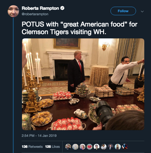 Clemson footballers completed a perfect season last week. This week, our president presented them with his favorite American fare: a $3 Filet O’Fish sandwich and Wendy’s wraps. Somehow, the video is even more bizarre than the picture.