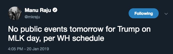 Second order of business: Let’s see how President Dementia will celebrate one of the 20th century’s most transcendent figures on his federally-mandated holiday.