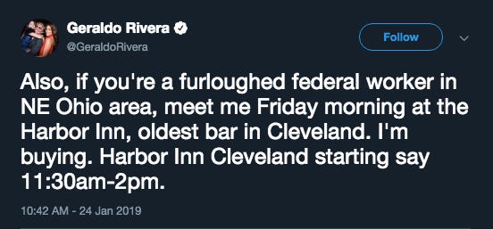On a brighter note, furloughed workers in the Cleveland area can assuage the pain of not getting paid for a second pay-period in a row by getting blackout drunk at noon on a Friday on the tab of Geraldo Rivera.
