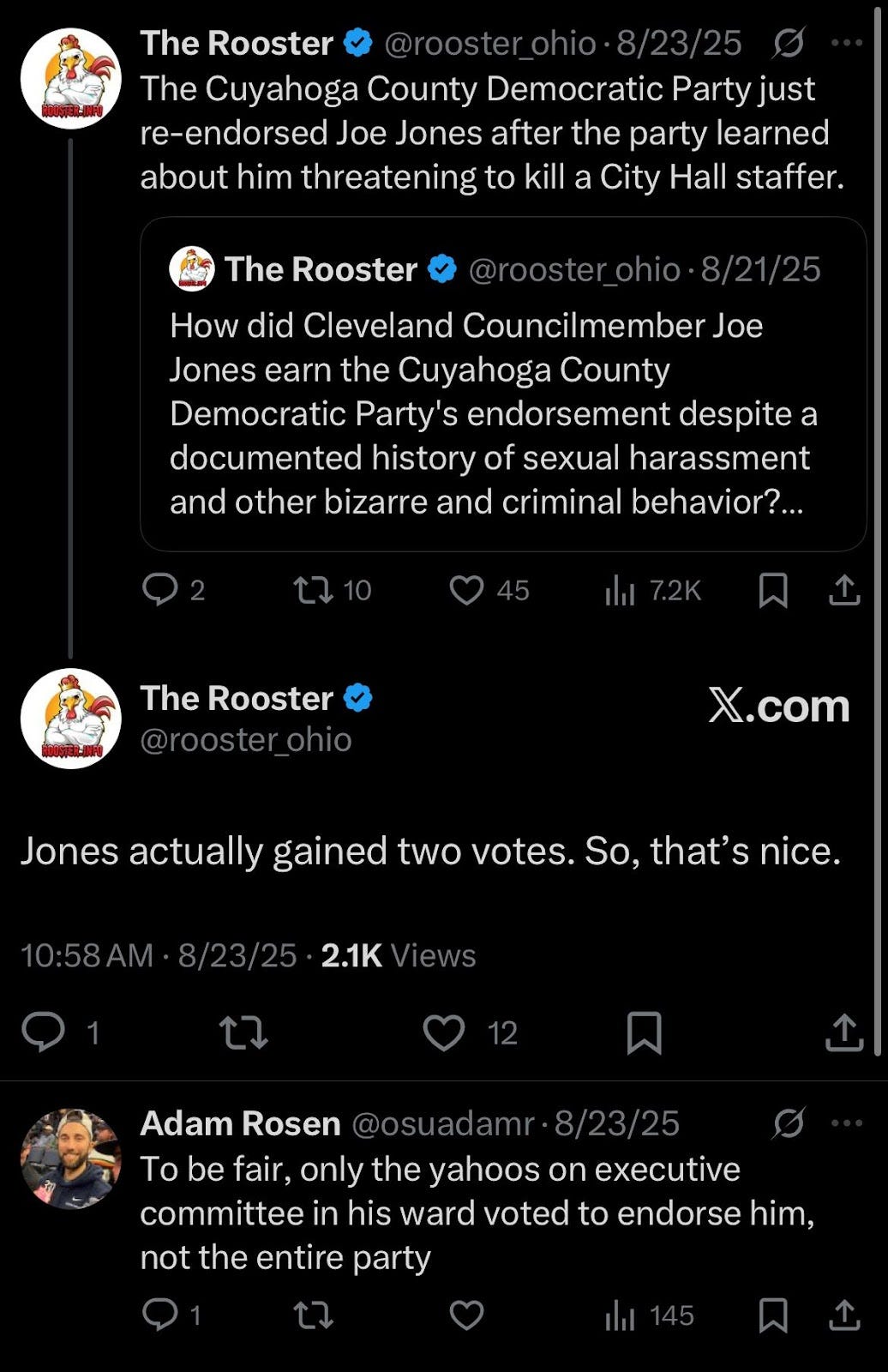 The comment was made in response to The Rooster’s tweet announcing that the Democratic Party’s Executive Committee for Cleveland Ward 1, which includes the predominantly Black East Side neighborhoods of Lee-Harvard and Union-Miles, doubled down on their endorsement of Councilman Jones.