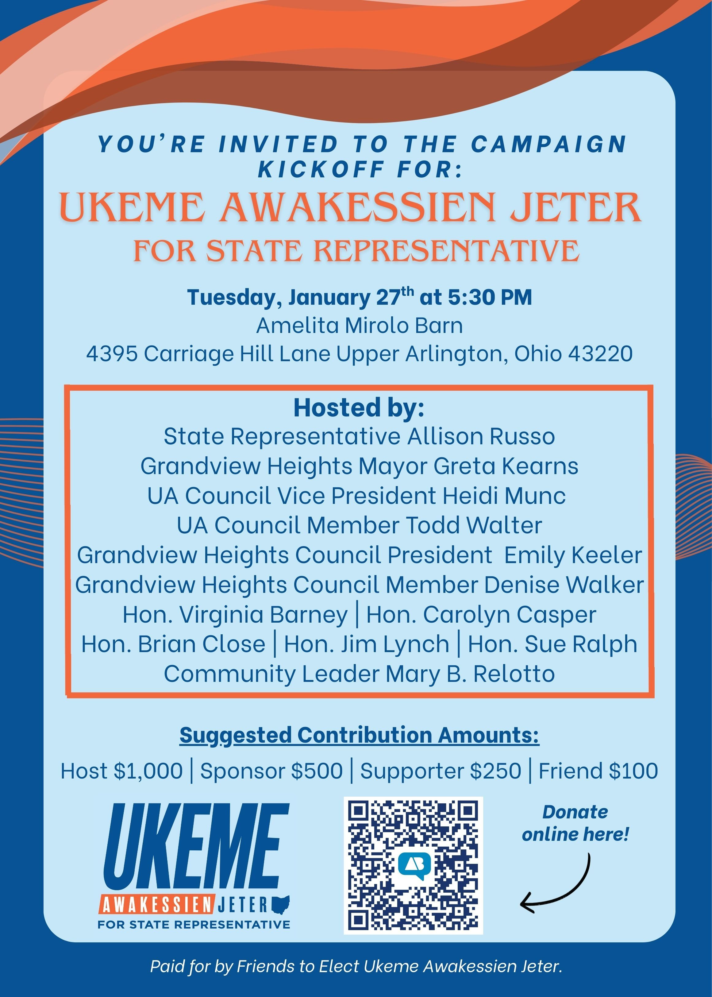 On Monday evening, Awakessian Jeter will kick off her campaign in Ohio House District 7, a safe Democratic seat currently held by State Rep. Allisson Russo, who’s running for Secretary of State ahead of being term-limited later this year.