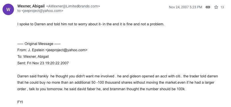 Abigail Wexner, for her part, would label further communication with Epstein “fine” and “not a problem” in Nov. 20007 when seeking financial advice that her husband’s wealth apparently couldn’t buy anywhere else, days before the Great Recession.