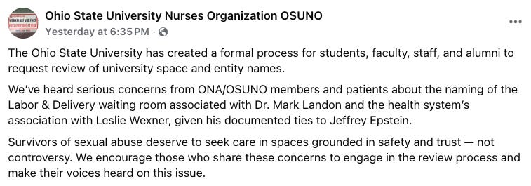 But recent revelations about Epstein’s ties to Dr. Mark Landon, who delivered Wexner’s children and will have a maternity waiting room at the new hospital named in his honor, already had University Nurses calling for supporters to submit a request that Ohio State review Wexner and Landon’s naming rights: