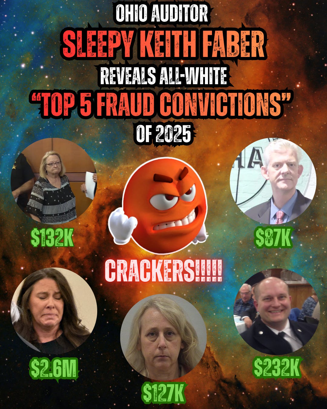 Ohio Republican Auditor “Sleepy Keith” Faber must agree, because on New Year’s Eve, his office unveiled the “Top 5 Fraud Convictions of 2025,” and they were all white Republicans: