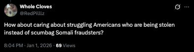 We could deport every Somali immigrant, fraudster or not, and these people would have the same problems in their lives. And they would probably shift their ire to the next group of undesirables as a way to feel a modicum of superiority within their bleak, unfulfilled lives.