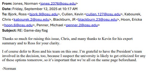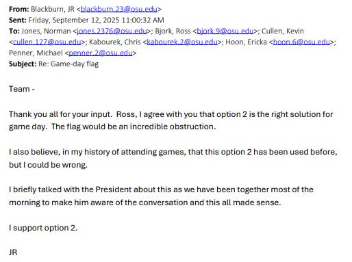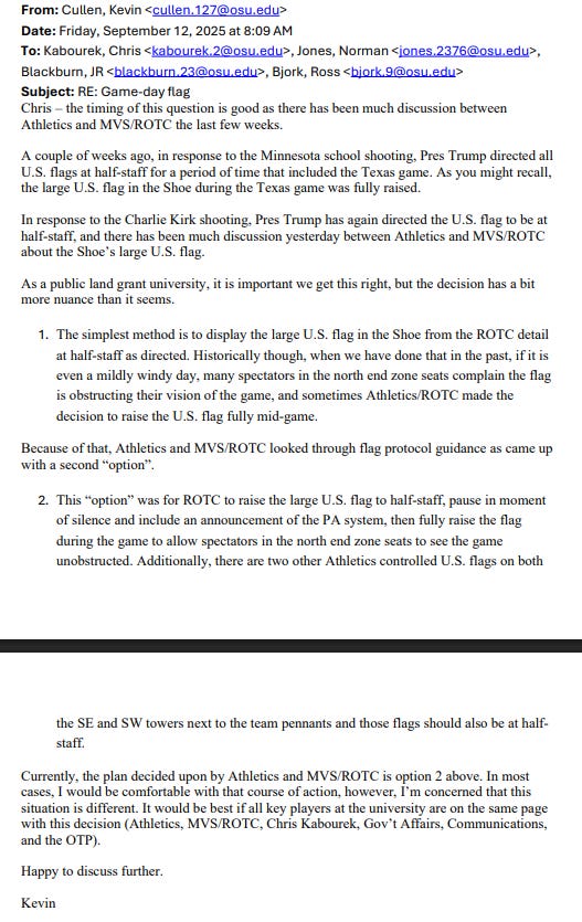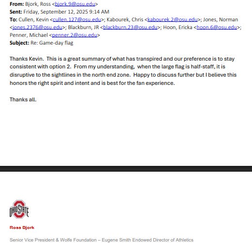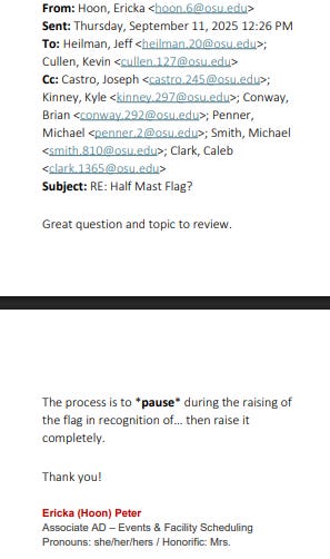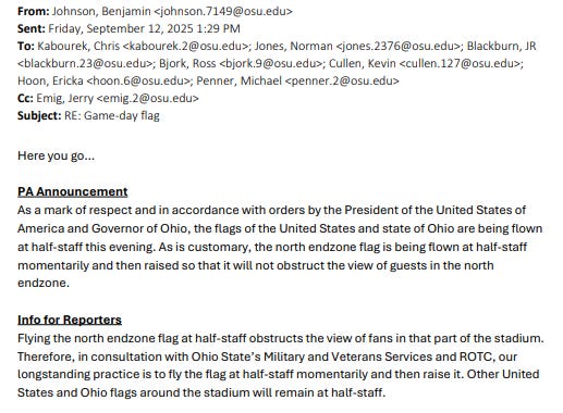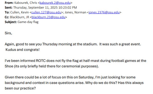 Meanwhile, late Thursday night, Chris Kabourek, an Ohio State Vice President and senior advisor to President Slapshot Carter, emailed Norman Jones, Dean of Undergraduate Education and Kevin Cullen, Director of Military & Veteran Services, about Ohio Stadium’s half-mast policy.