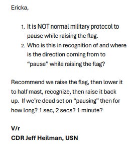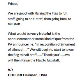 After a bit of back-and-forth, Commander Heilman noted that it would be very helpful (emphasis his) if the public address announcer informed the 100,000+ attendees about the lowering of the flag and the planned moment of silence.