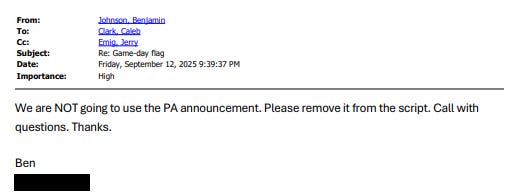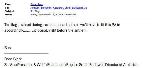 Johnson’s email also stood in contrast to the option already selected by President Slapshot Carter and Athletic Director Bjork, which included a moment of silence and a reference to a “mark of respect,” clearly intended for Kirk, given the concerns about public criticism.