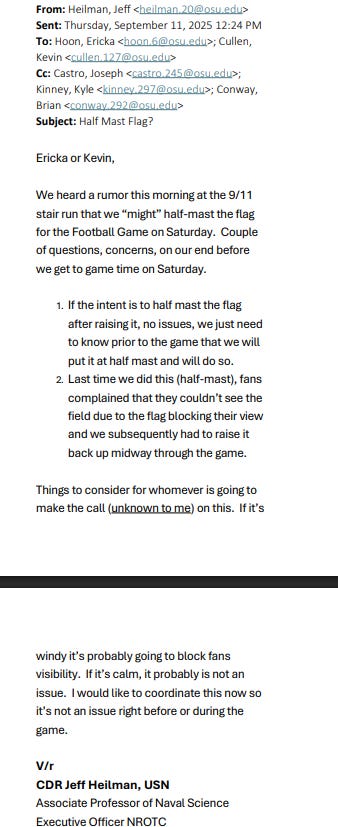 Commander Jeff Heilman, executive officer of NROTC at Ohio State, emailed Erick Hoon, Associate Director of Athletics for Event Management and Assistant Vice Provost Cullen about a “rumor” about the university possibly lowering its flag to half-mast for Saturday’s football game.