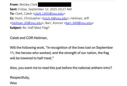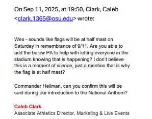 Roughly 90 minutes later, Associate Athletics Director Caleb Clark wrote to the Ohio Stadium public address announcer Wesley Clark that it “sounds like” the flags would be lowered in remembrance of 9-11 and that he “didn’t believe” there would be a moment of silence.