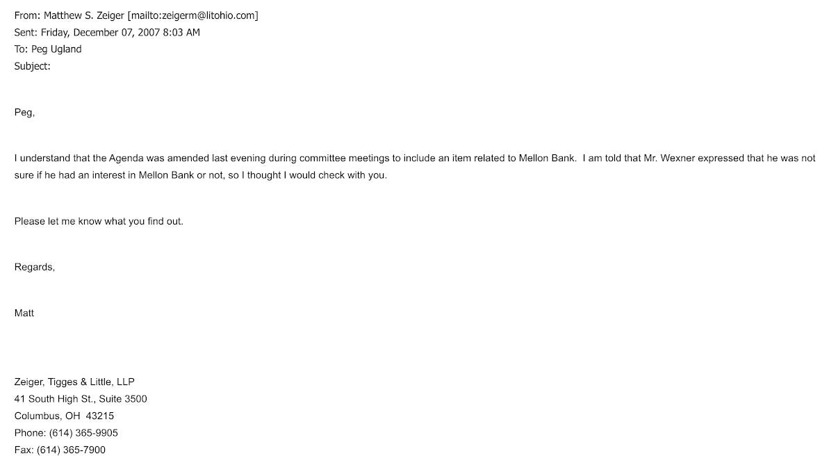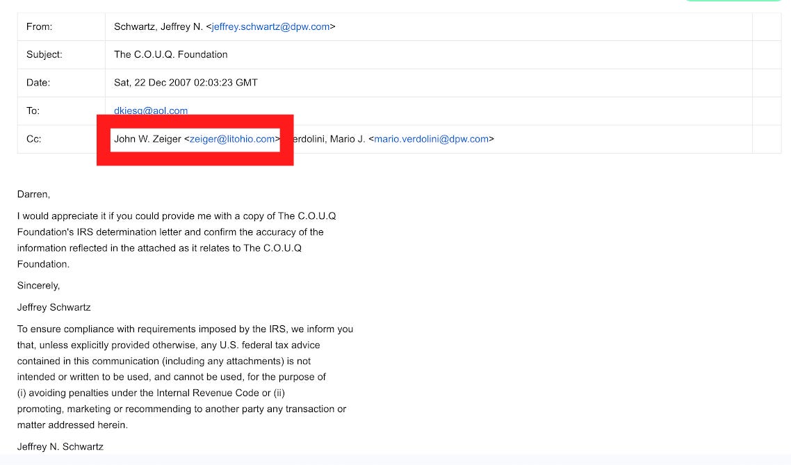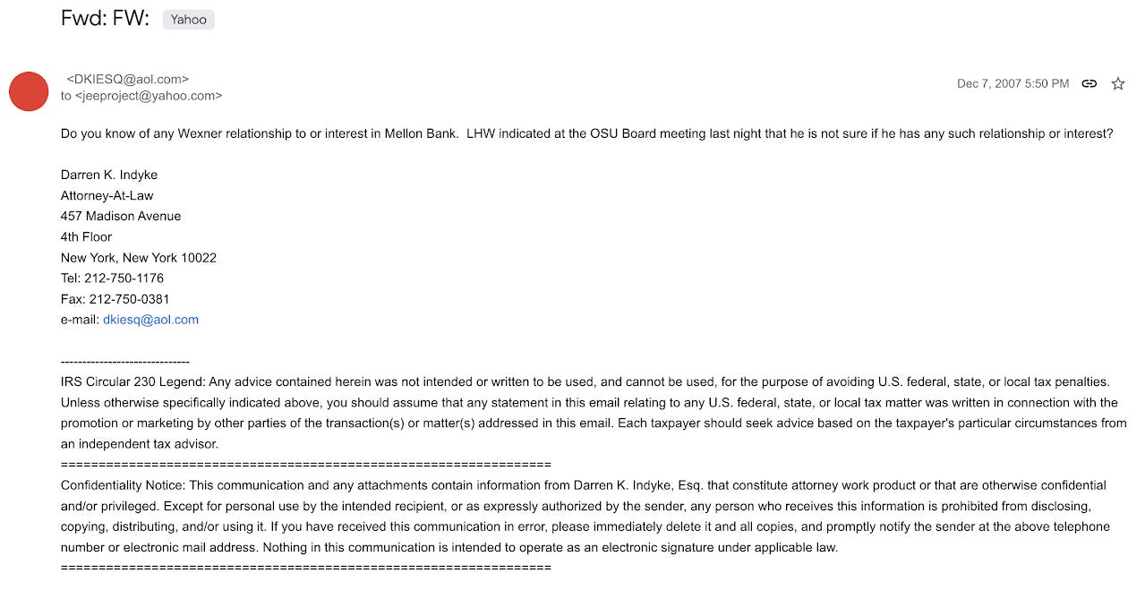 What Drop Site didn’t mention was that the current Ohio State Board of Trustees chairman, John Zeiger, whose firm has long represented Wexner, was CC’d on the email that started Wexner’s attempt to claw back their money: