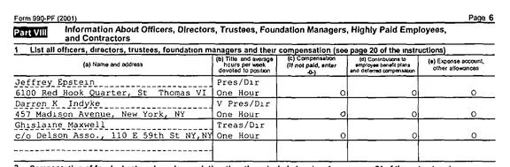 We know the C.O.U.Q. Foundation is an Epstein-controlled entity because its 2001 tax returns, obtained by The Rooster, list Epstein as president, his lawyer, Darren Indyke, as vice president, and imprisoned sex trafficker Ghislaine Maxwell as treasurer.