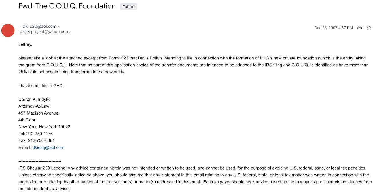 On December 26, 2007, the Wexners’ attorneys prepared IRS forms to create a new private foundation for Leslie Wexner, called YLK Charitable Fund. Indyke emailed Epstein a draft copy of the IRS submission, asking for Epstein’s approval on a disclosure document that showed Epstein’s C.O.U.Q. trust would transfer more than 25% of its assets into YLK. The new fund had only two officers, Peg Ugland and Abigail Wexner; it was named “YLK” after the initials of Abigail’s father, Yehuda L. Koppel, of Israel’s founding generation.