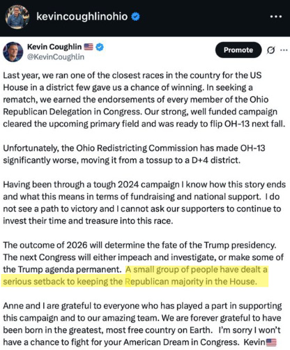 Contrary to what I reported last week, Ohio Democratic Party Chairwoman Kathleen Clyde and “donor table” head Misha Barnes backed a referendum despite questions about funding, the reality of gathering 250,000 signatures throughout the winter, possible ratfucking from Secretary of State Frank LaRose, and the MAGA-fied Ohio Supreme Court looming to adjudicate a new map after a successful referendum.