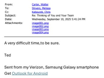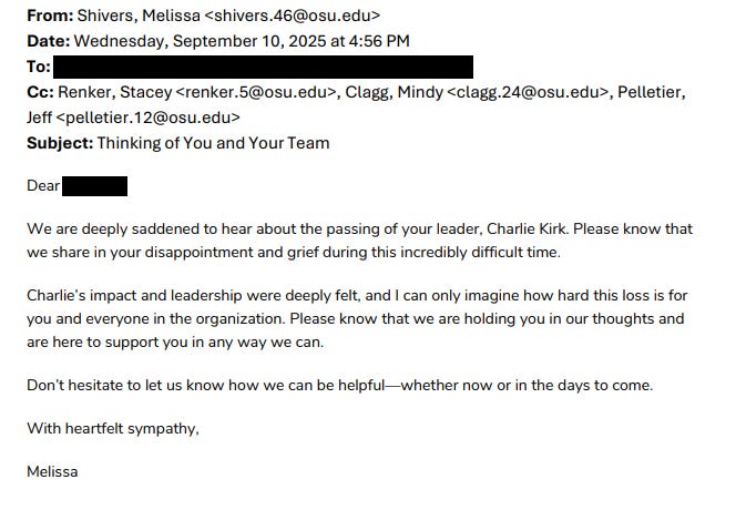 Vice President Shivers went a step further—while also revealing that Ohio State Turning Point isn’t even an officially recognized student group—in letting her boss, President Ted “Slapshot” Carter, know she had extended her well-wishes to the group.