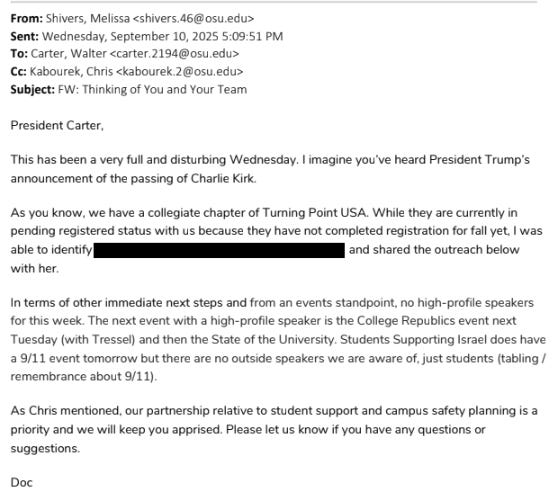 Buried in the records return was another illuminating exchange between Melissa Shivers, the Ohio State Senior Vice President for Student Life and Ohio State’s Turning Point USA Chapter.