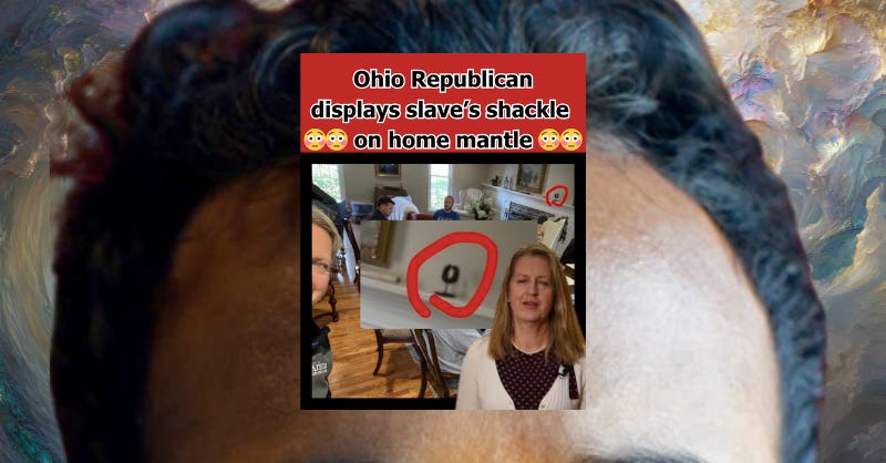 Roegner had previously been crowned as “Senator Slave Shackle” for displaying what she hilariously described as an unspecified “artifact from Africa” on her home’s mantle in a since-deleted Facebook post:
