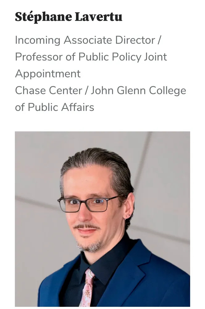 That’s not a coincidence, as new hire Stéphane Lavertu is currently listed as the “Incoming Associate Director / Professor of Public Policy” at the Chase Center.
