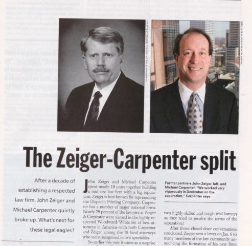 In 2004, Sonya Huber of Columbus Monthly detailed the amicable split between Zeiger and Carpenter, who at the time led one of the most powerful law firms in Columbus.