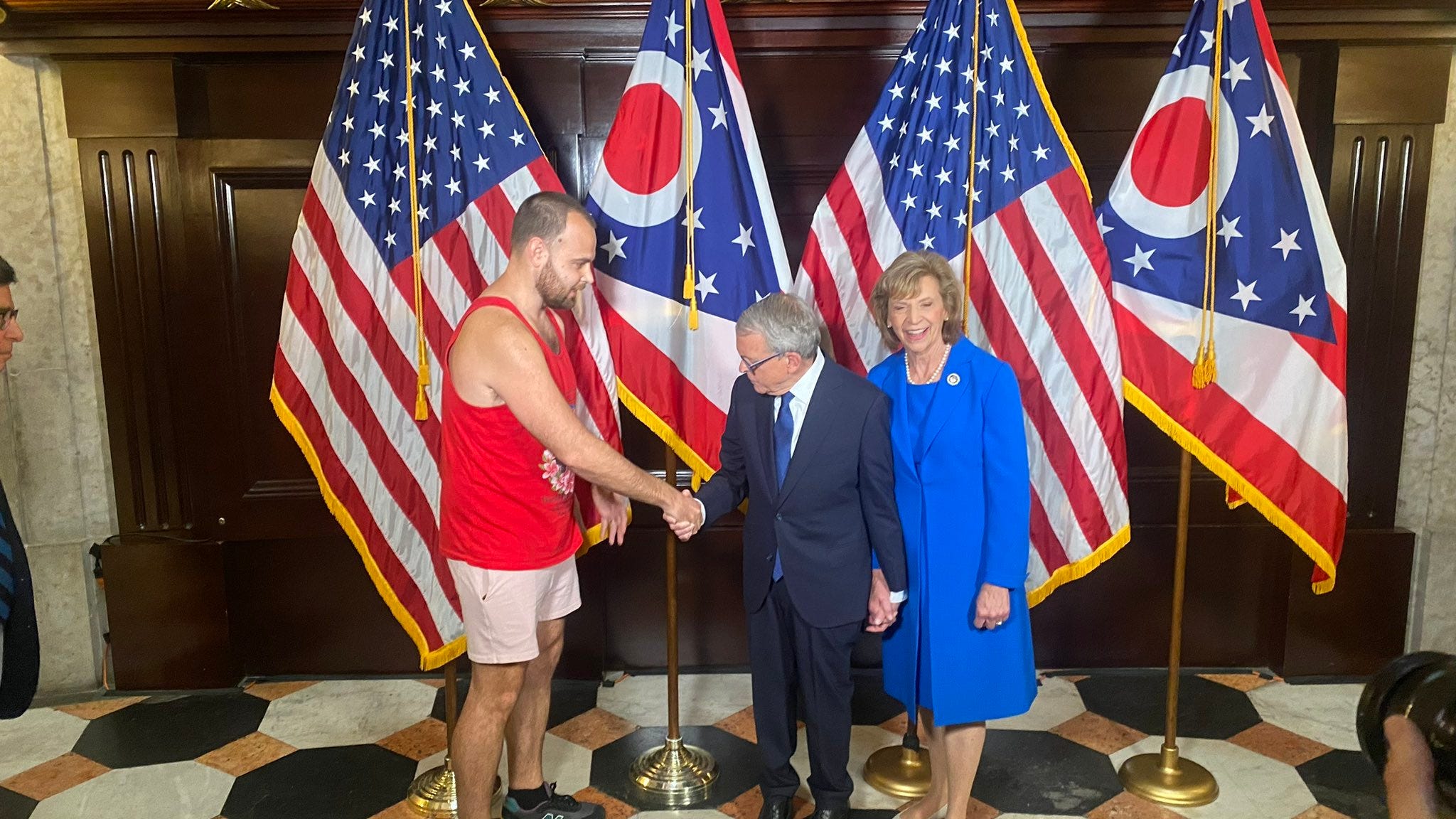 How tall are you? Or, how small is DeWine? You looked like Godzilla shaking his hand.