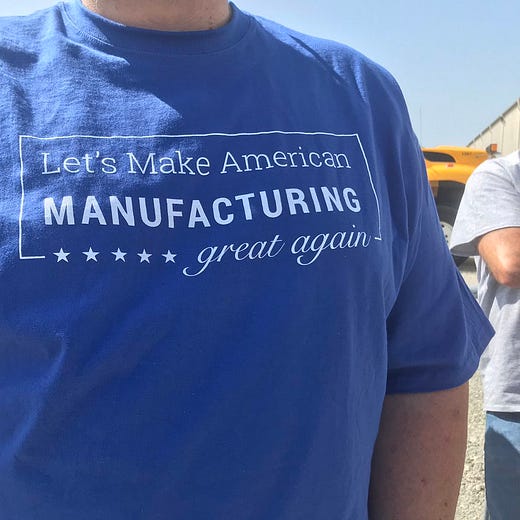 The last shirt might as well be wishing for Bigfoot and Elvis to join another remix of Old Town Road. The glory days of the 1960s when you could walk around the corner and choose about one of four factories that paid a living wage are over. The manufacturing barons declared long ago no worker more overpaid than an American and they will always be able to exploit the next developing country for a cheaper labor pool.