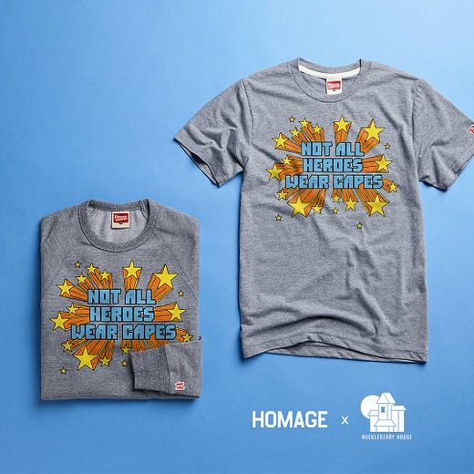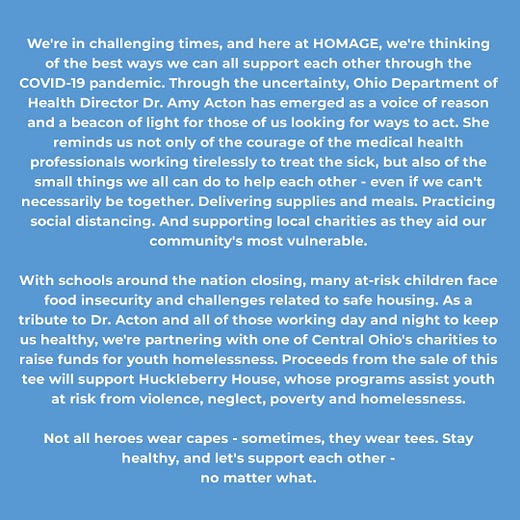 Instead, Homage uses crises like *checks notes* global pandemics to create half-baked graphic t-shirts with the note that proceeds will go to a good cause.