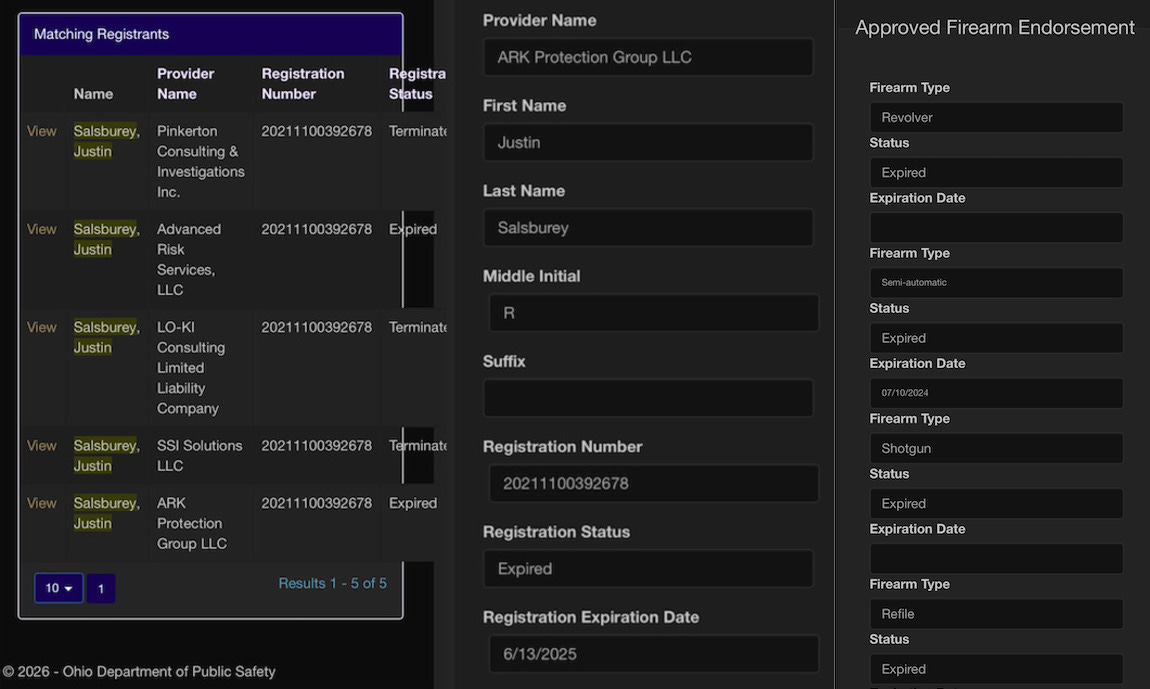 However, Owens is in the same boat as Salsburey in that he’s currently unlicensed to work as a private security officer or to carry any standard weaponry in Ohio.