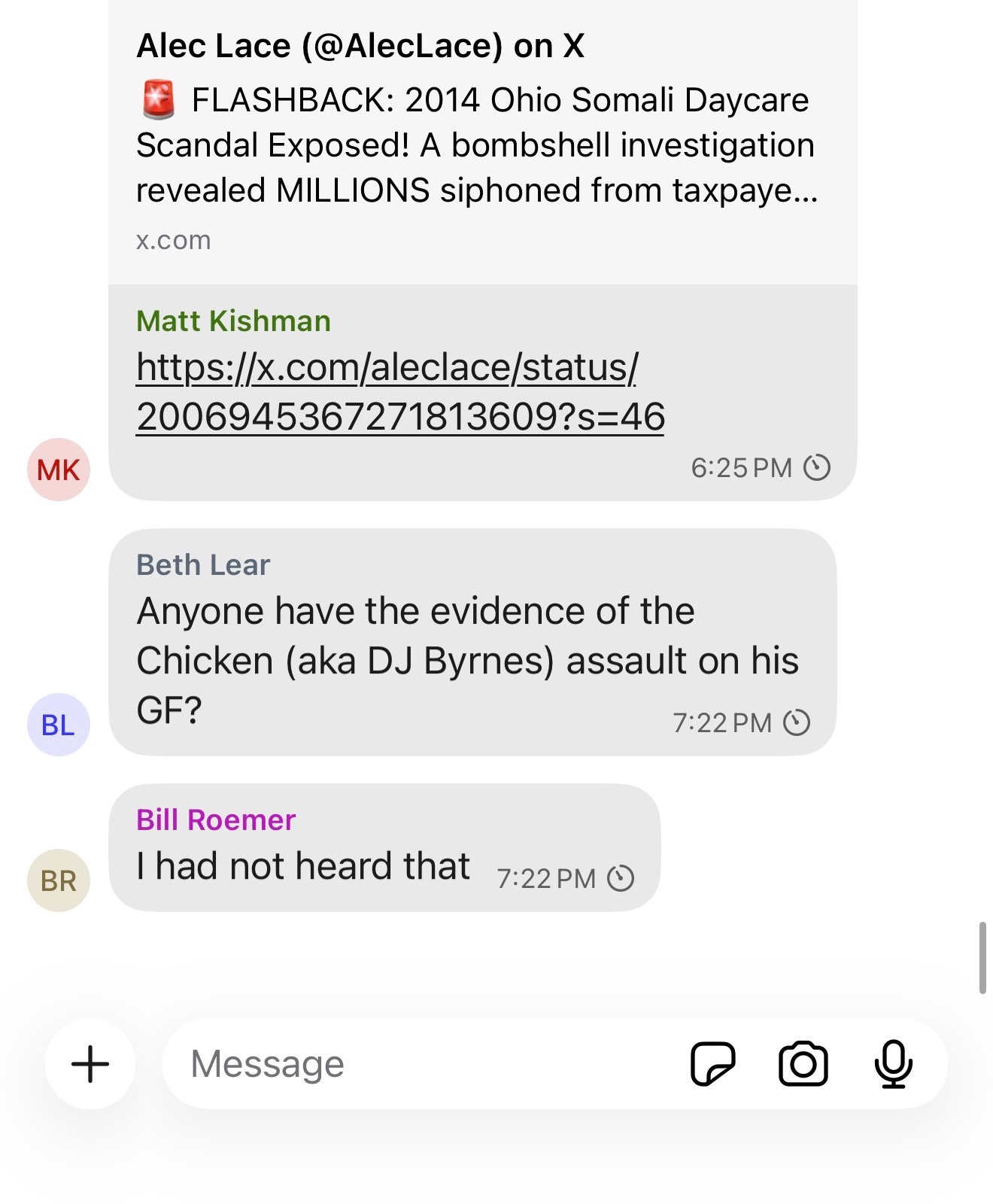 So, it caught my surprise on Friday night when a four-star Republican general in the Patriots Caucus alerted me to the fact that Lear was in a Signal chat entitled “136th Republicans,” which featured a large majority of Republican State Representatives, looking for “proof” that I had “assaulted” my girlfriend.