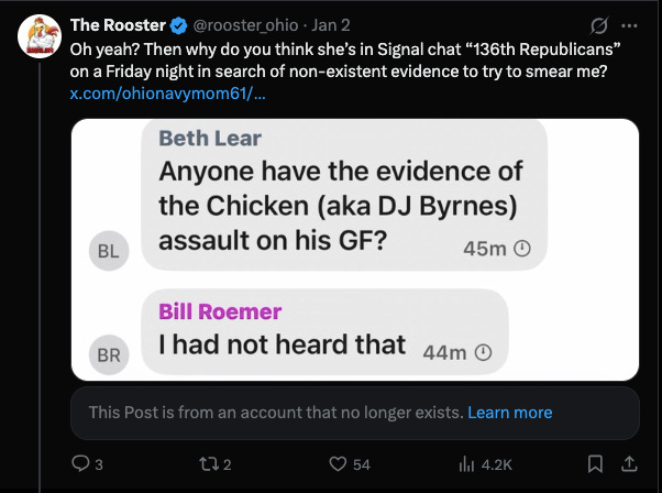 The most damning evidence linking Lear to the account is OhioNavyMom61 calling me “The Chicken”—a lazy nickname originated by State Rep. Gary Click (R-Vickery)—at the same time Rep. Lear was seeking damaging information about “The Chicken” in a group she thought only her fellow Republicans could see.