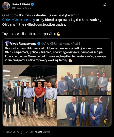 Frankly, every labor leader should be embarrassed to pose alongside LaRose and Ramaswamy, two unprincipled jackals who will say anything for their next political promotion.