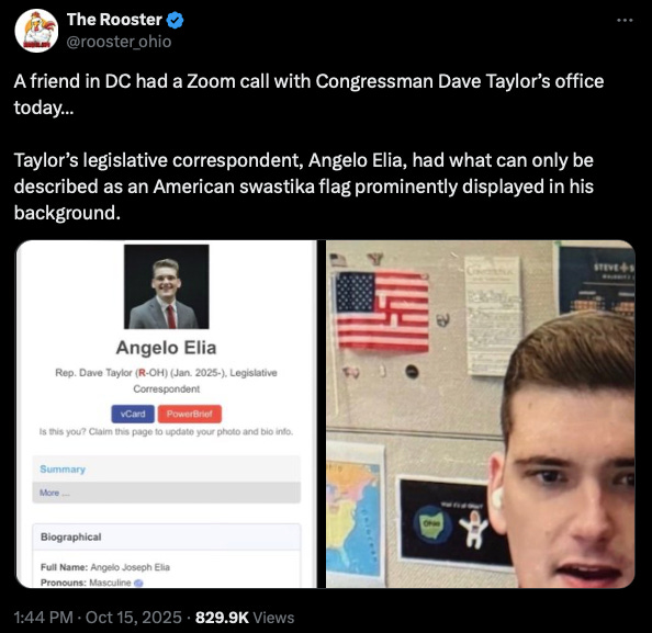 Yesterday, The Rooster broke the story about Angelo Elia, a legislative correspondent for Congressman Dave Taylor (R-Ohio), featuring what can only be described as an “American swastika” flag in his office during a Zoom meeting on Wednesday morning.